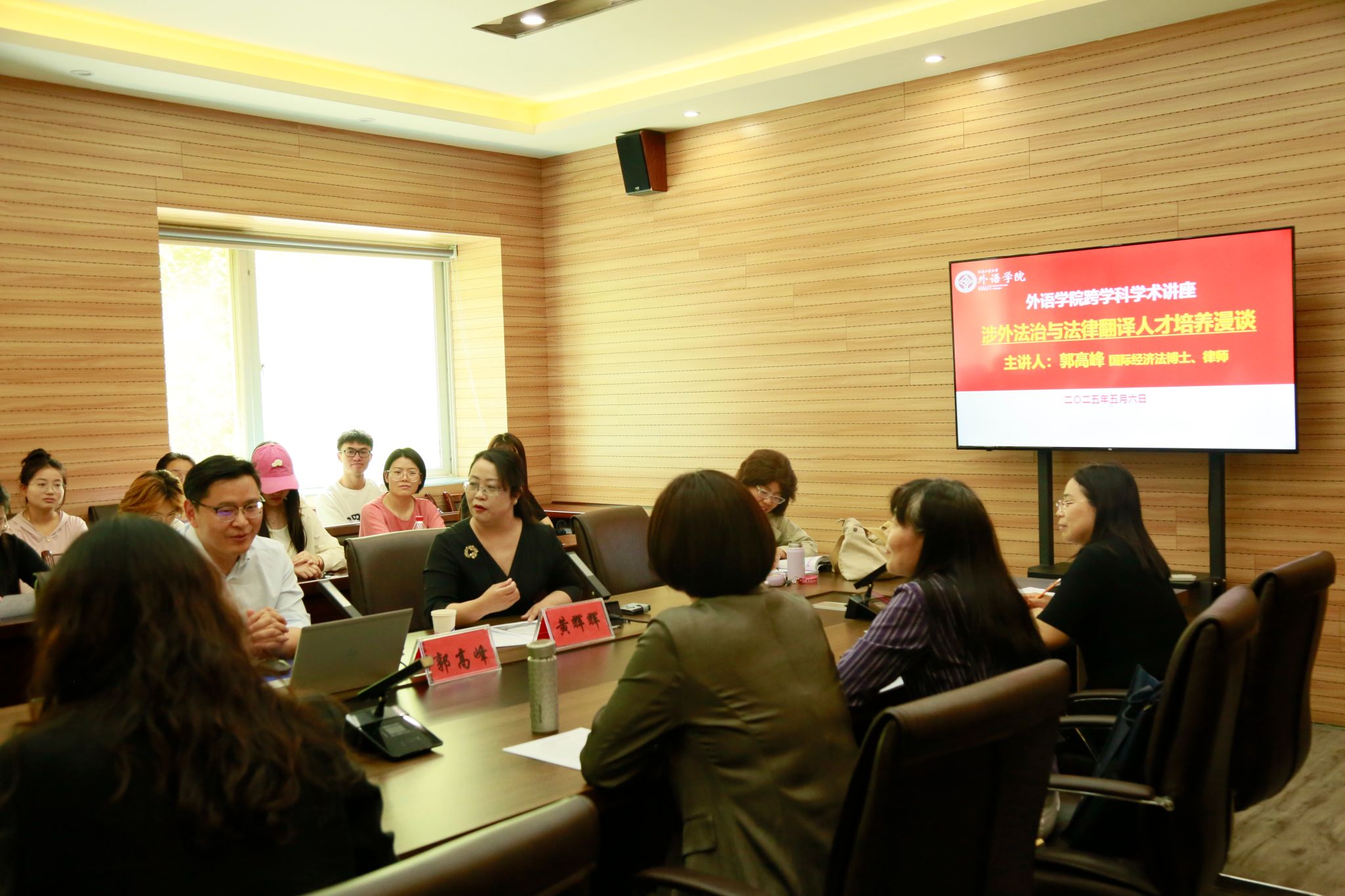 为适应新时代涉外法治建设需求,深化翻译专业人才培养模式改革,5月6日下午91麻豆 在5231会议室举行“涉外法律服务与法律翻译人才培养”跨学科学术讲座。西南政法大学的国际经济法博士、广东金桥百信律师事务所合伙人郭高峰律师应邀出席,与学院领导班子成员、各系部负责人及专业教师围绕高素质复合型外语人才培养路径展开研讨。本次讲座由院长黄辉辉主持。