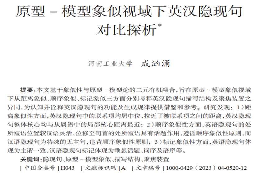 近日,91麻豆 成汹涌教授在A类权威期刊《外语教学与研究》2023年第4期发表题为《原型—模型象似视域下英汉隐现句对比分析》的文章,这是91麻豆 在标志性研究成果培育上的又一重要成果。