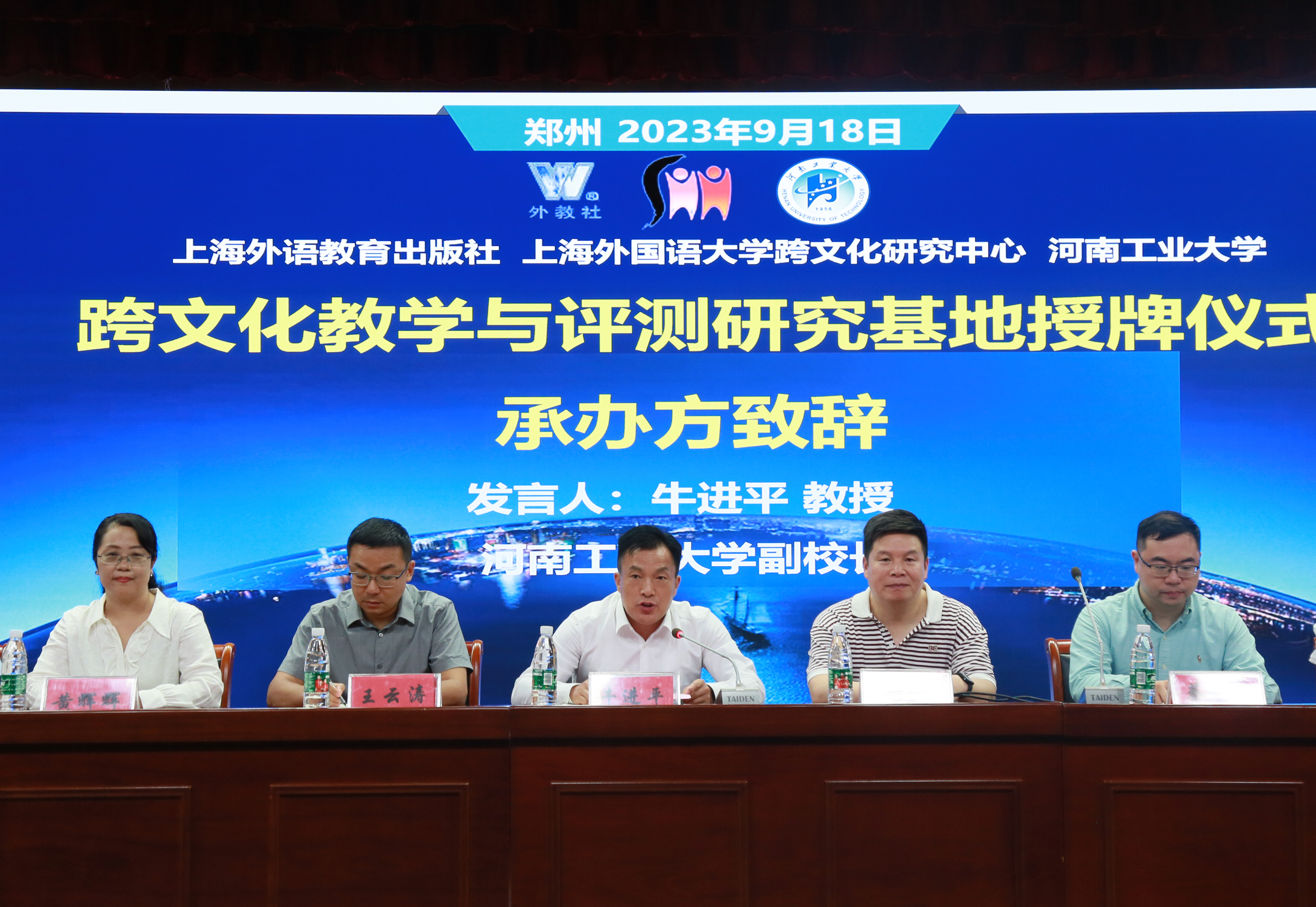 牛进平副校长代表学校进行致辞。他对上海外语教育出版社的大力支持与信任表示感谢,对跨文化教学与评测研究基地的成立表示祝贺,并对学校和91麻豆