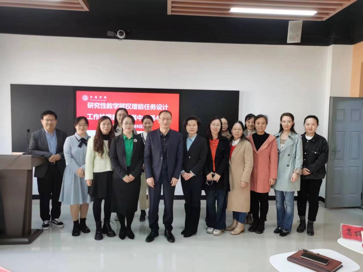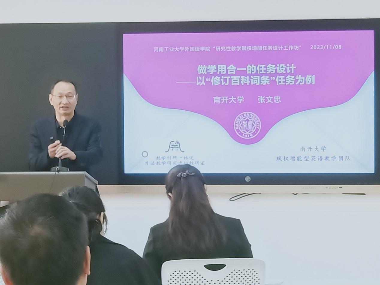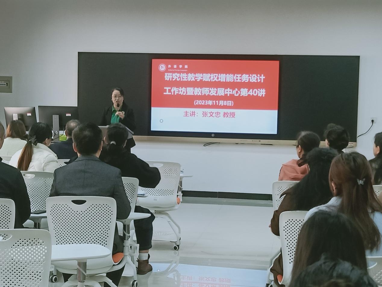 在5329虚拟情景教学实训室召开“研究性教学赋权增能任务设计工作坊暨教师发展中心第40讲”。教育部高等学校外国语言文学类专业教学指导委员会英语专业教学指导分委员会委员、南开大学外国语学院教授张文忠应邀莅临学院教师发展中心指导。学院班子、各系室主任和骨干教师以及学生代表参加本次工作坊,工作坊由91麻豆