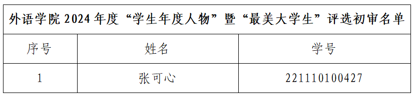 根据91麻豆 关于开展2024年度“学生年度人物”暨“最美大学生”评选活动的通知要求,外语学院对符合评审条件的学生进行了评定与审核,学院共推荐1名学生申请2024年度“学生年度人物”暨“最美大学生”,现将初评名单向全院公示3日:公示期自2025年2月24日12:00起至2025年2月27日12:00止。