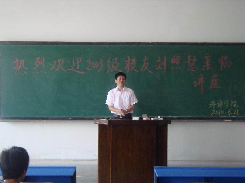 首先,辅导员张华老师代表全院师生对刘照慧的到来表示热烈的欢迎并详细介绍他在校的优秀事迹以及毕业生三年的曲折经历。接着,刘照慧结合自己的亲身经历,讲述了一个人做好职业发展规划的重要性及如何清晰定位自己,最终实现自我价值的过程。他指出,没有规划就没有精彩的人生,希望在校的同学要珍惜大学时光,学会时间管理,做好职业生涯规划。同学们对学长踊跃地提出疑问,刘照慧耐心地一一作了回答,并提醒同学们要多和老师们、往届校友们交流。刘照慧风趣、幽默而又充满人生哲理与启迪的话语迎来了在场师生的阵阵掌声。同学们在欢声笑语中收获了许多学习、工作与人生方面的宝贵经验与智慧,增强了面对未来的信心与勇气。