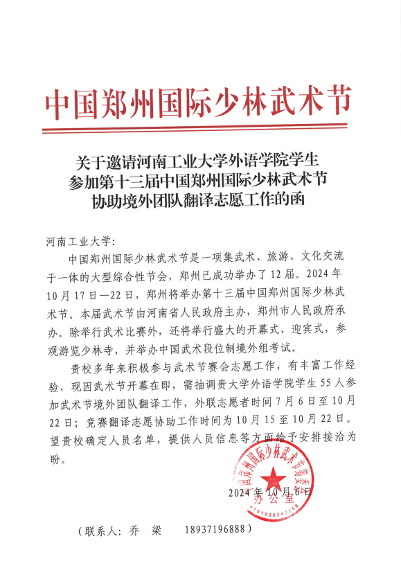 2024年10月17日至22日,第十三届郑州国际少林武术节暨中国郑州国际少林武术大赛在郑州举行。为了使广大外国朋友深入了解中国传统文化和赛事活动,帮助境外参赛团队和运动员顺利参与比赛,受郑州市体育局和第十三届郑州国际少林武术节筹委会邀请,外国语学院55名学子奔赴比赛现场开展境外团队翻译和比赛翻译志愿服务活动,志愿者的出色表现获得主办方和参会者一致好评。
