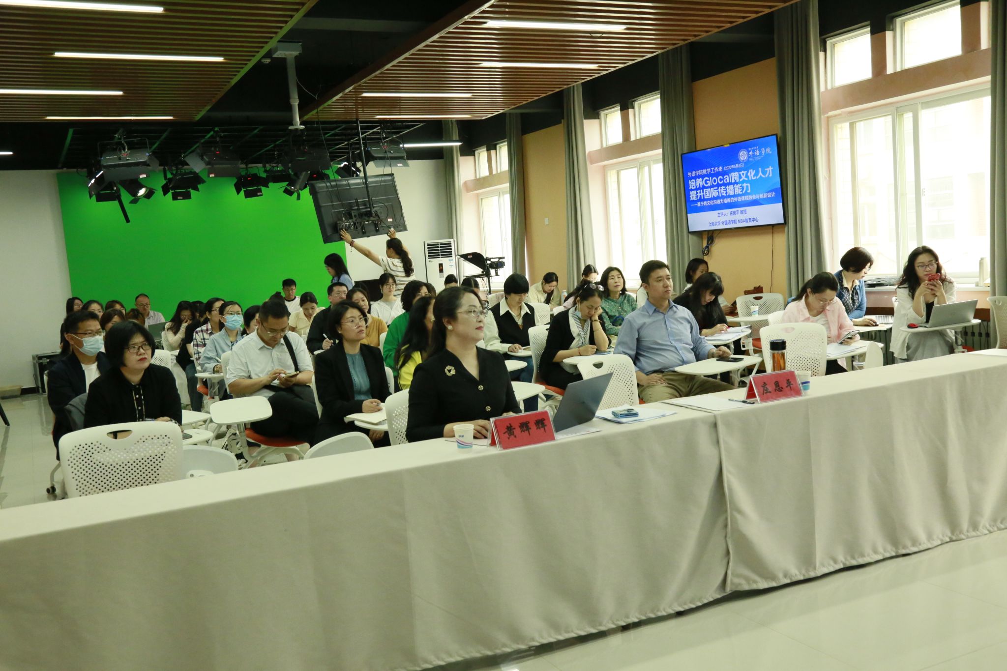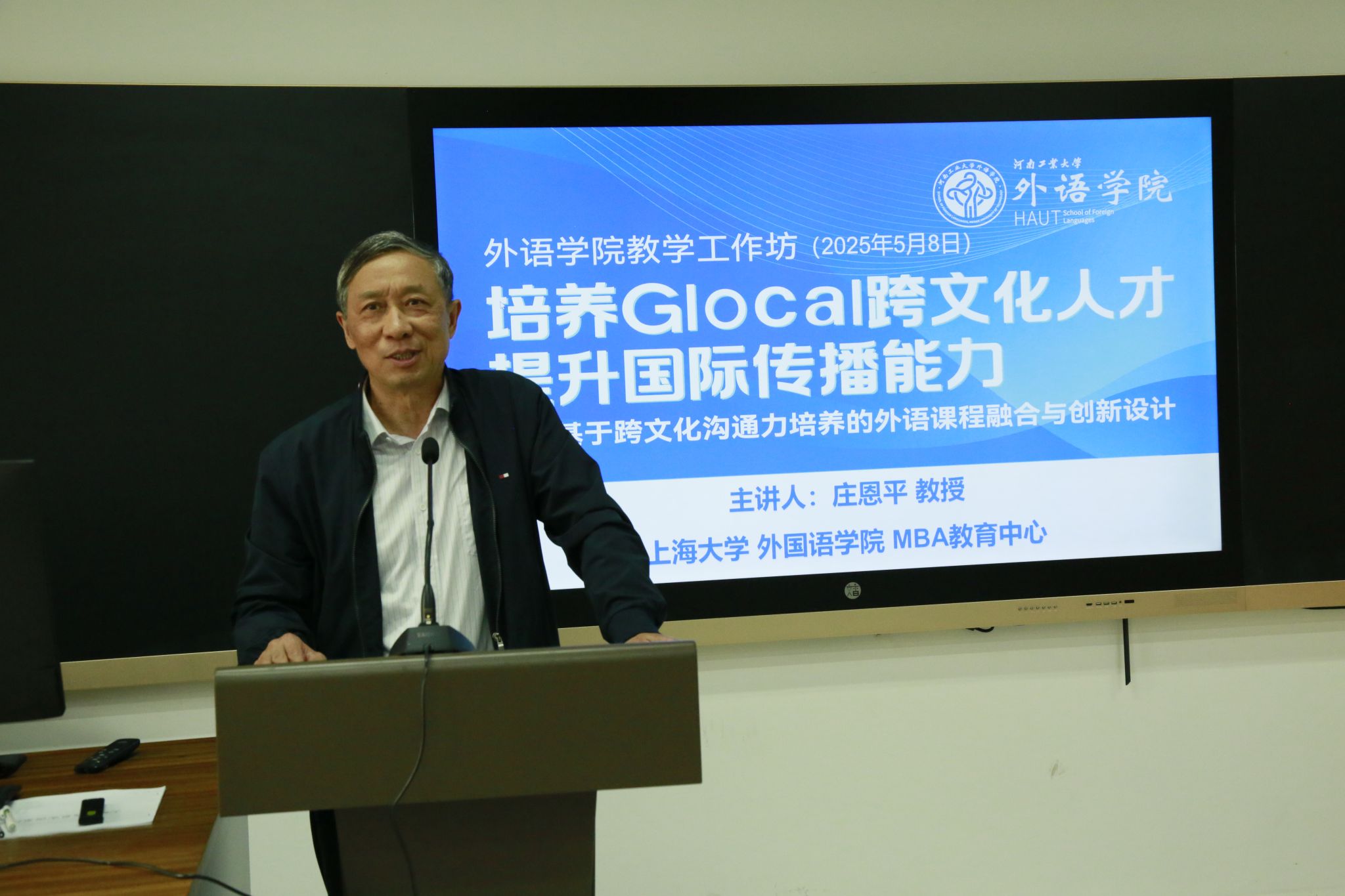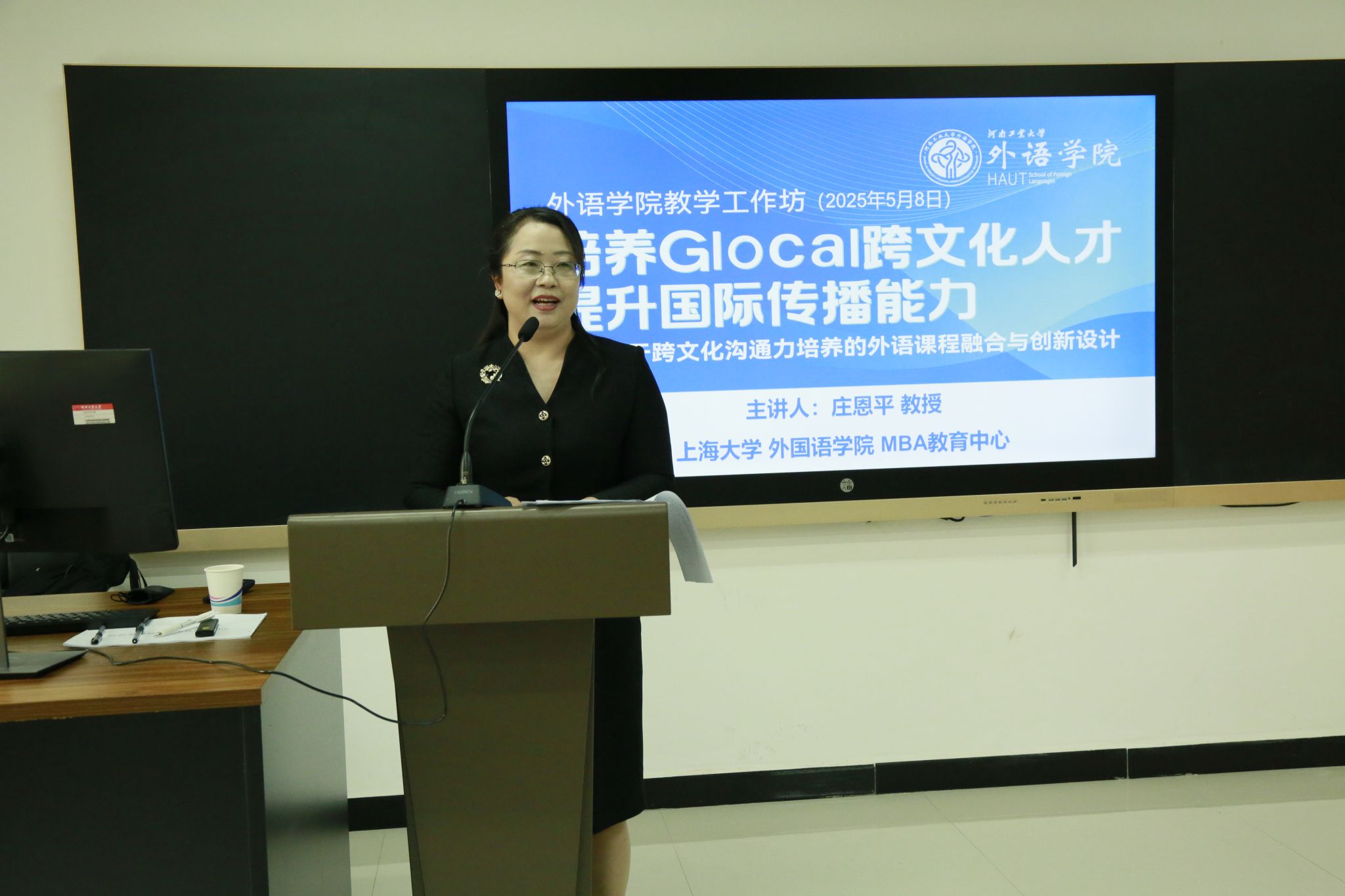 教师进行了为期一天的“培养Glocal跨文化人才,提升国际传播能力--基于跨文化沟通力培养的外语课程融合与创新设计”工作坊培训活动,活动由院长黄辉辉主持。