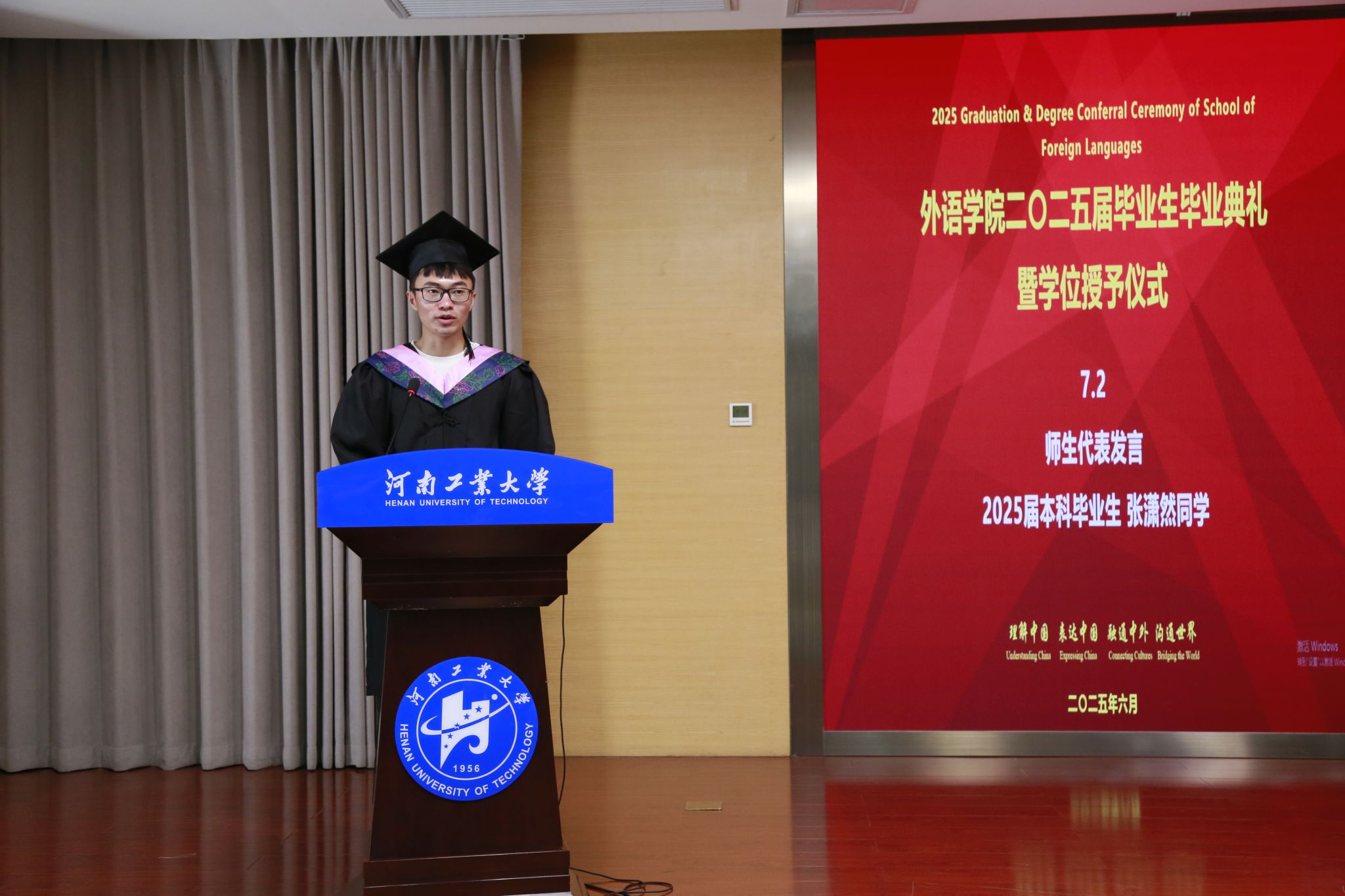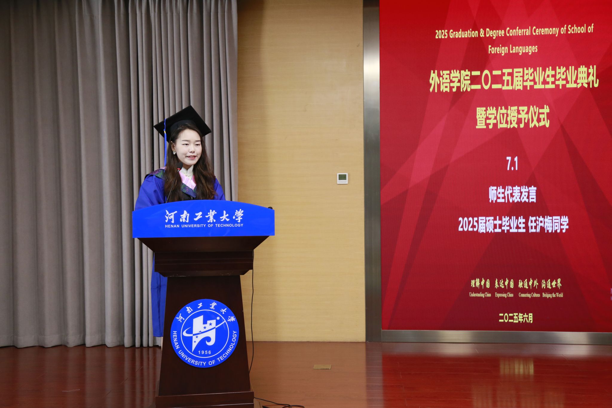 求学的光阴,如流水般逝去,同窗的情谊,似磐石般永恒,几年的求学生涯承载着同学们太多的回忆。毕业生代表2021级本科生张潇然、2022级学术学位研究生任沪梅依次发言。他们分享了自己在91麻豆