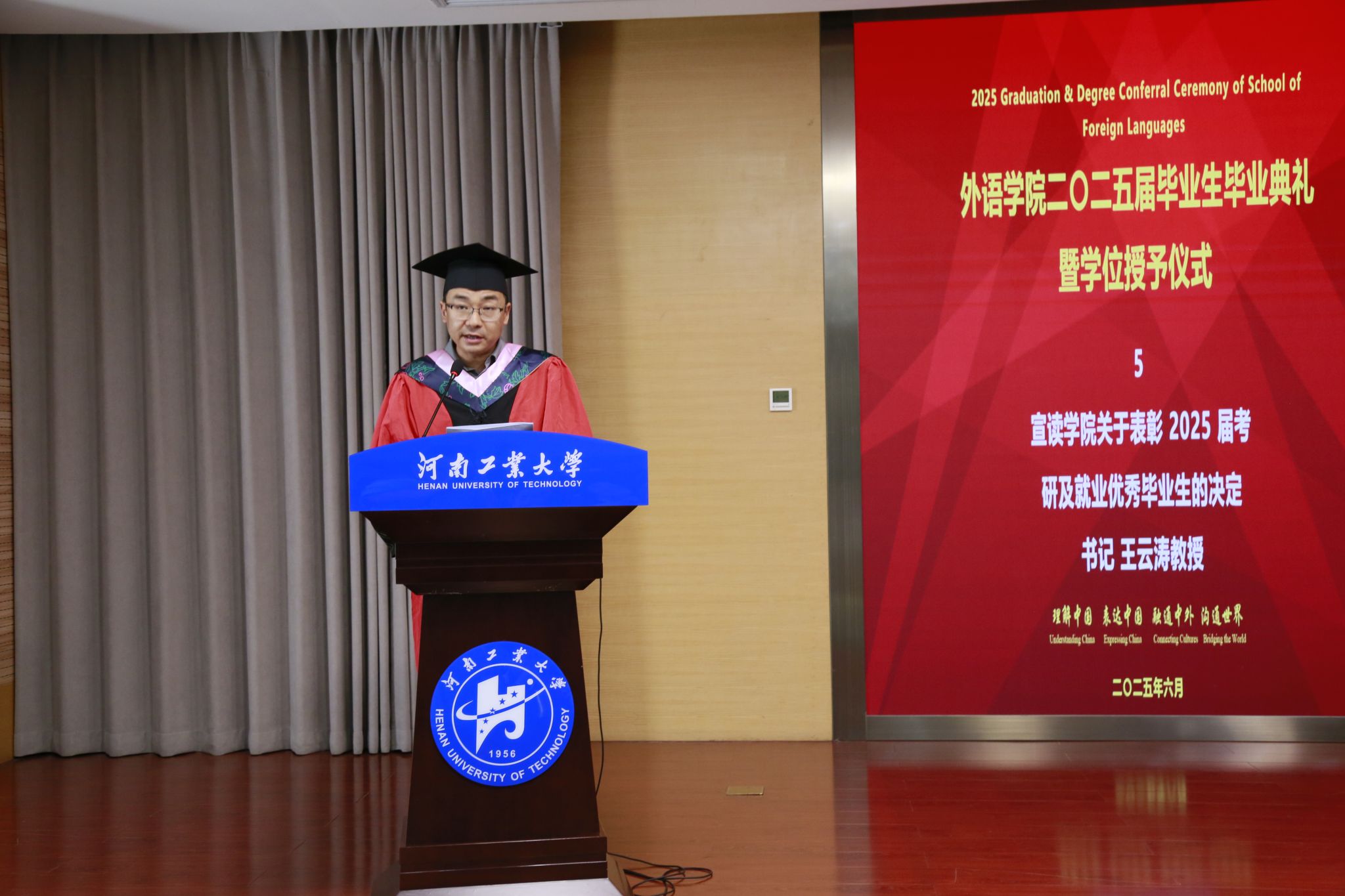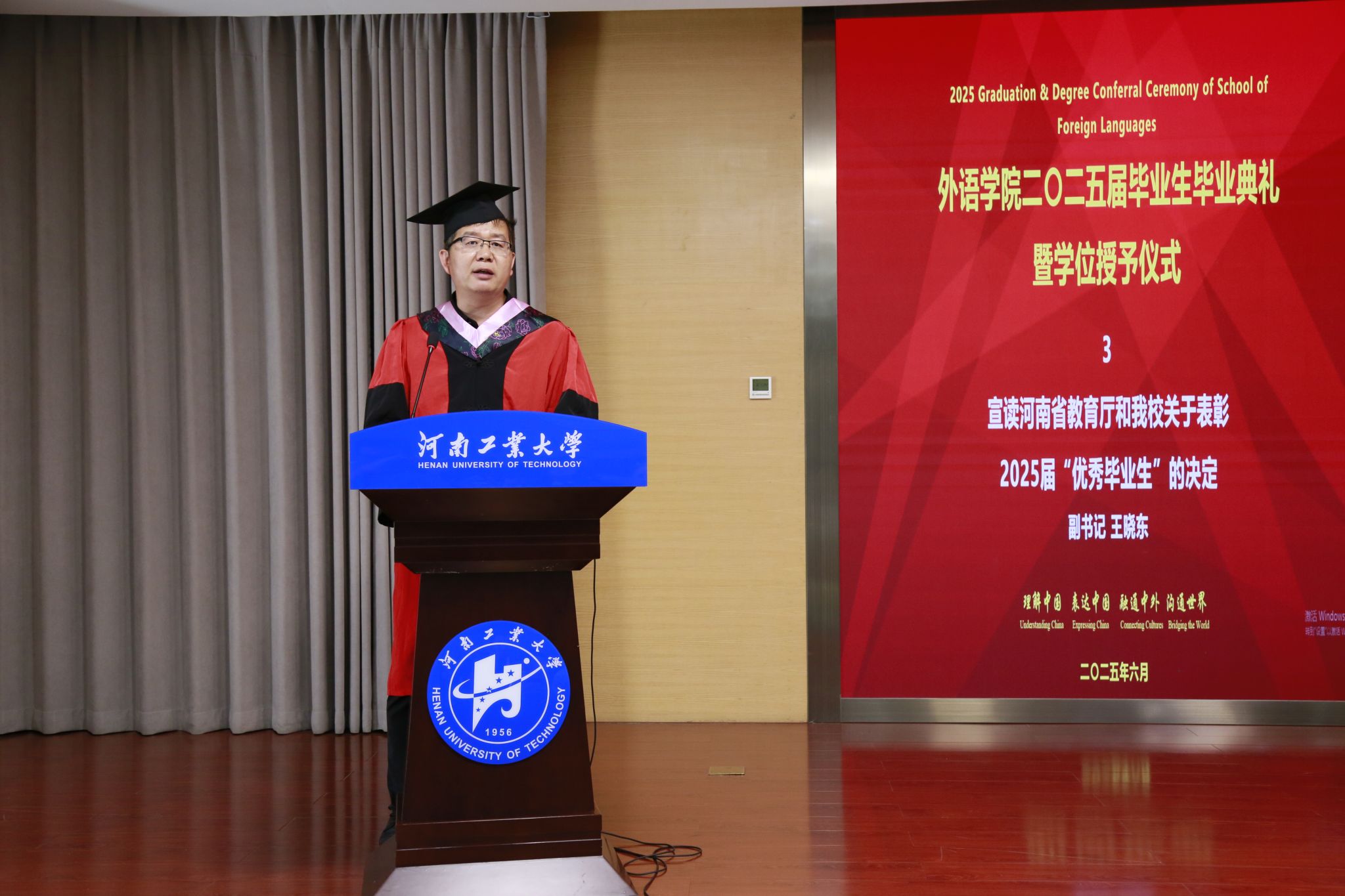 副院长沈国荣教授介绍学院2025届毕业生基本情况及学位授予情况。副书记王晓东宣读表彰优秀毕业生的决定。出席典礼的领导和老师为受表彰的优秀毕业生颁发了荣誉证书。