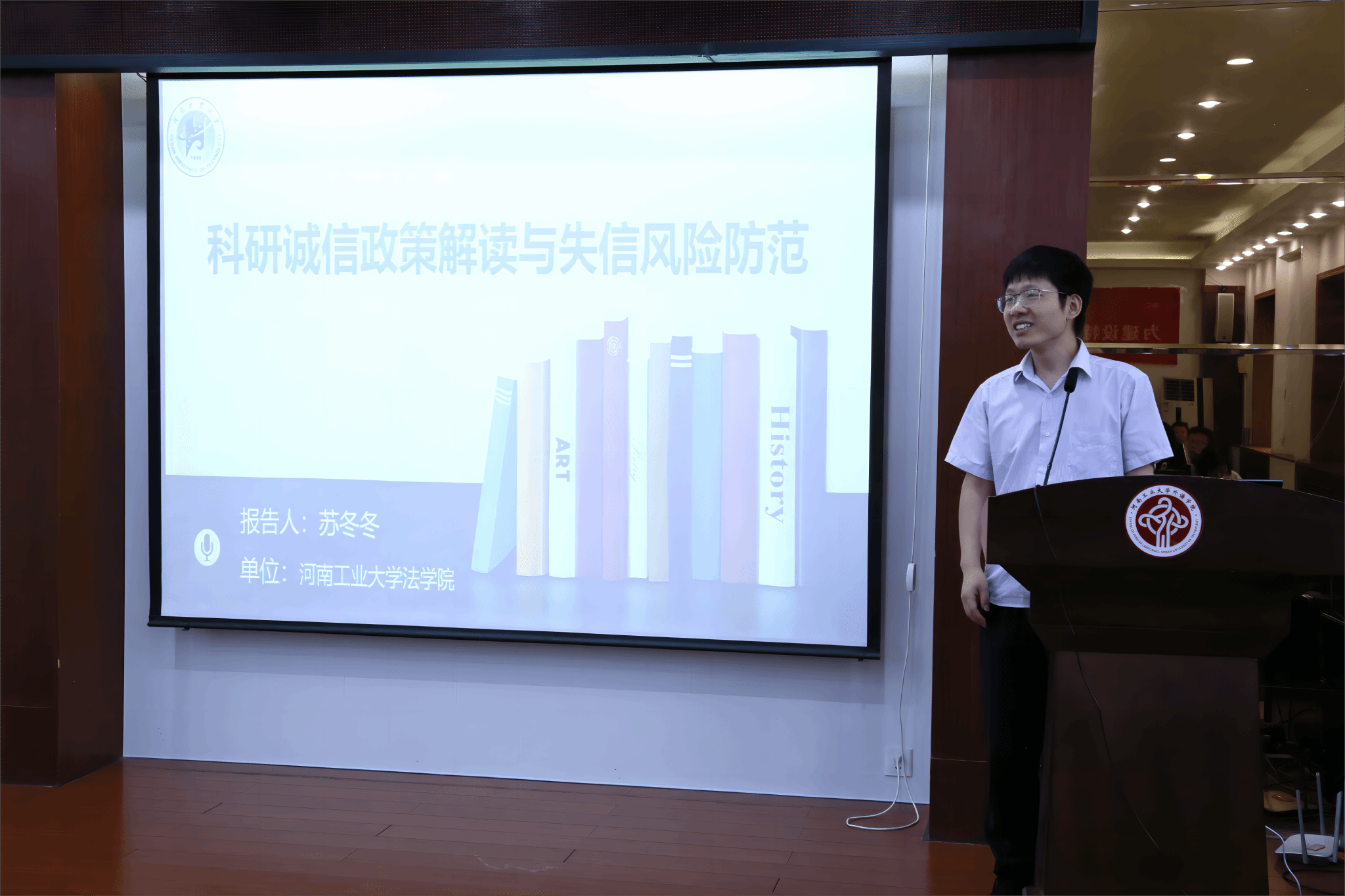 苏冬冬围绕“科研诚信政策解读与失信风险防范”,系统讲解了国家及学校层面的科研诚信政策,强调学术规范的重要性。他结合近年来学术不端案例,详细解析科研失信行为的认定标准及后果,并提出防范措施,呼吁全体教师严守学术道德,营造风清气正的科研环境。