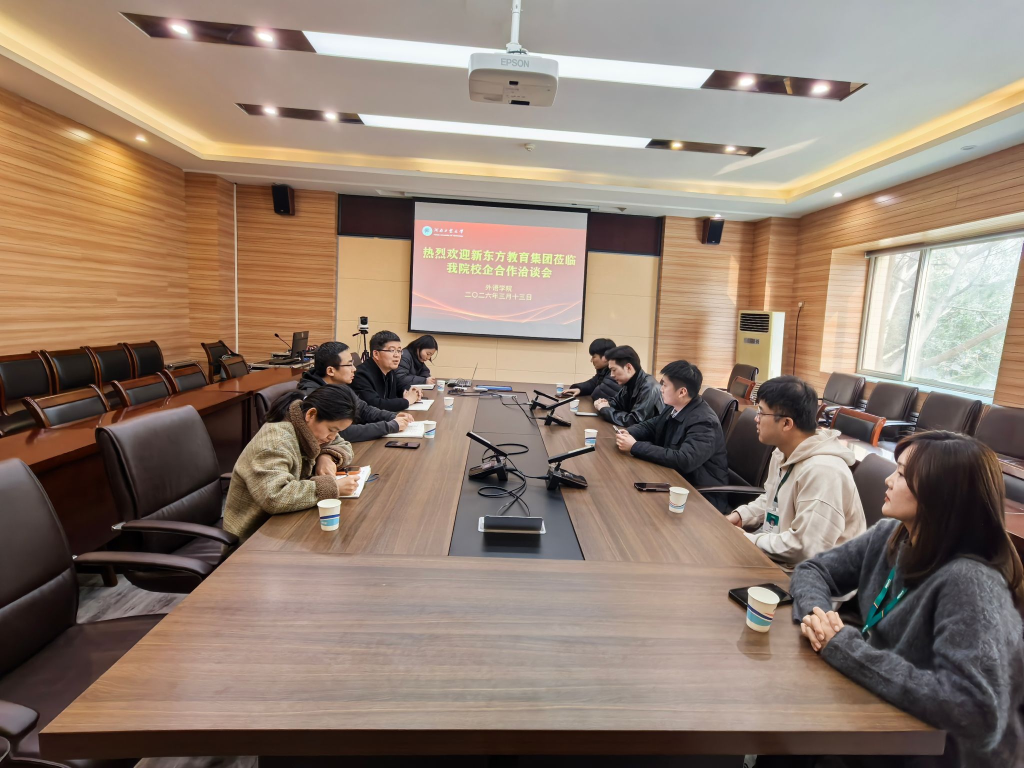 邀请新东方市场部负责人古明易及资深讲师团队一行来校开展校企合作洽谈。学院党委书记王云涛、副书记王晓东和全体辅导员参会。