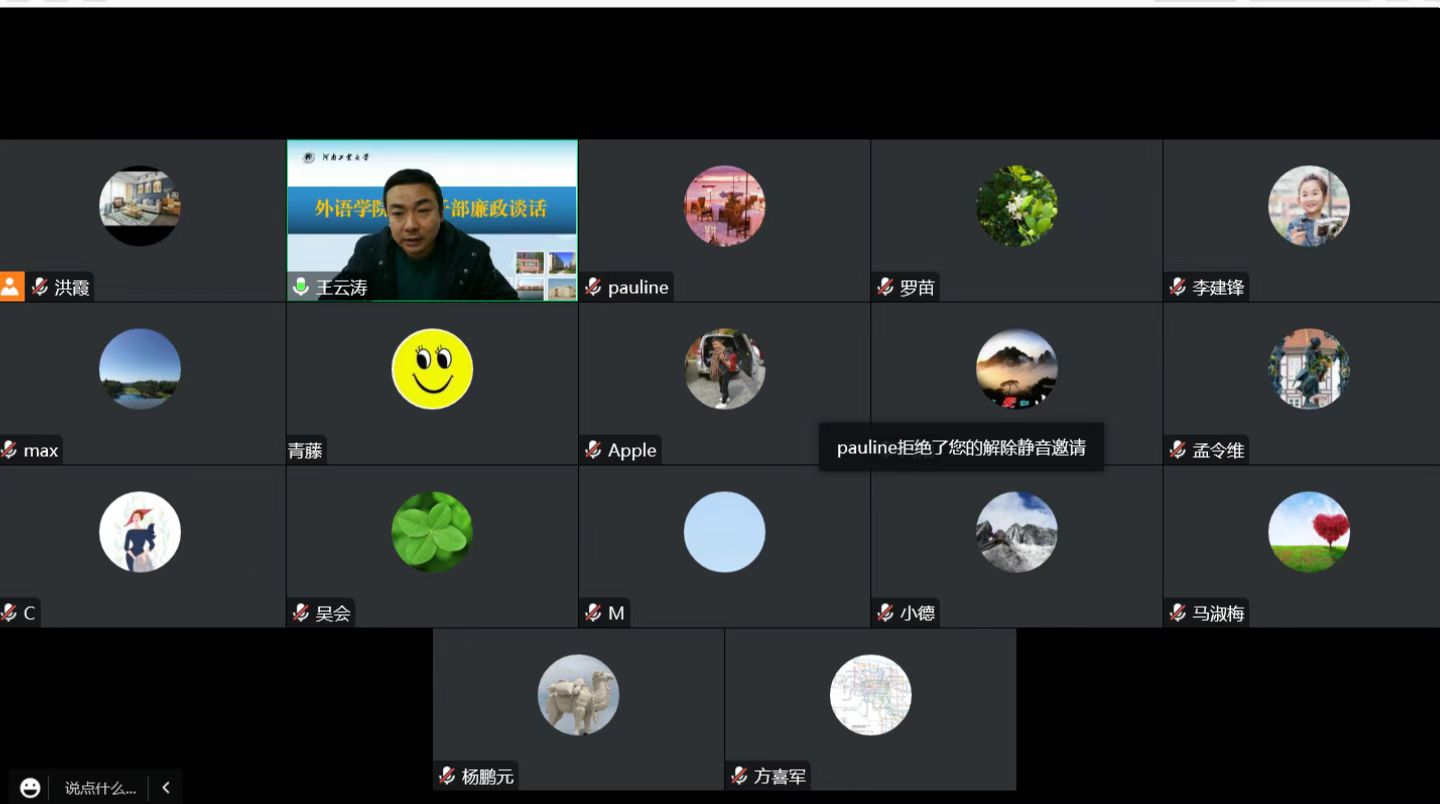 为进一步履行全面从严治党主体责任,落实党风廉政建设责任制相关要求,持续提升干部能力作风,12月27日下午,91麻豆 召开线上会议,组织开展新任科级干部集体廉政谈话暨书记上党课活动。学院班子成员、全体科级干部及行政人员参加了会议。院党委书记王云涛主持会议。