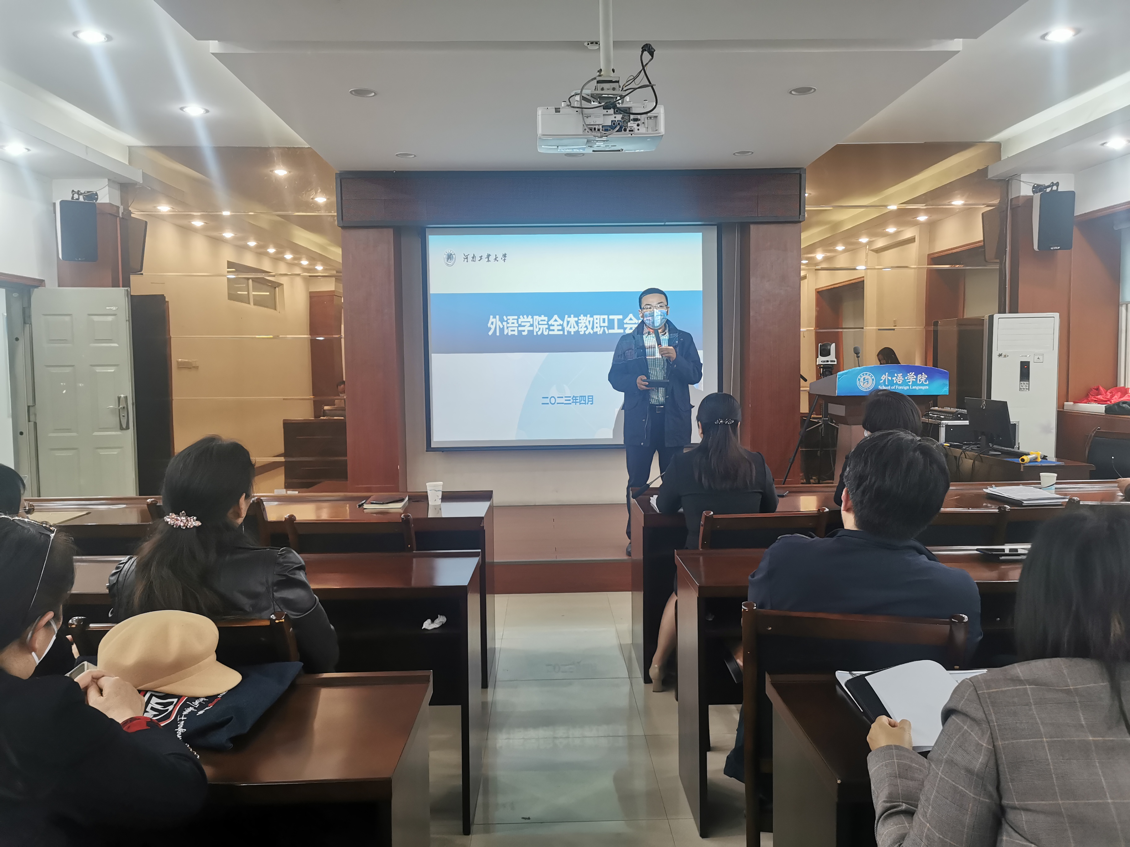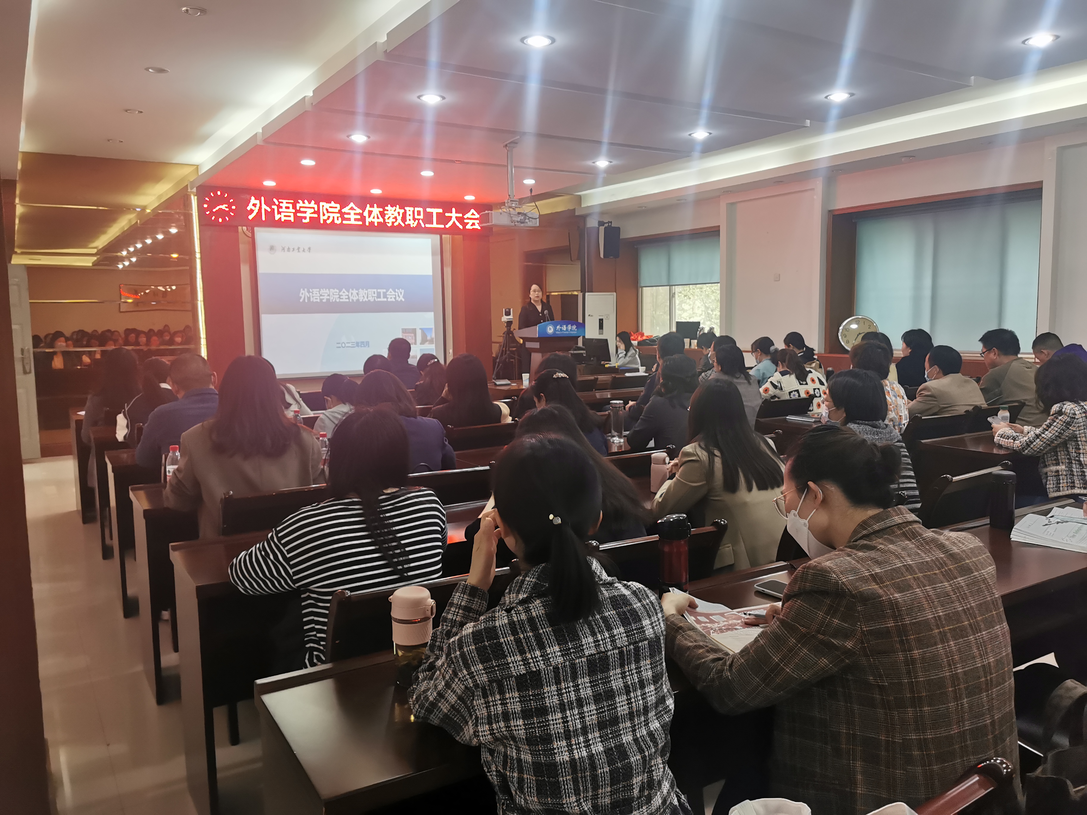 在5225会议室召开教职工大会对近期工作进行总结和部署。学院全体教职工参加会议。会议由院长黄辉辉主持。