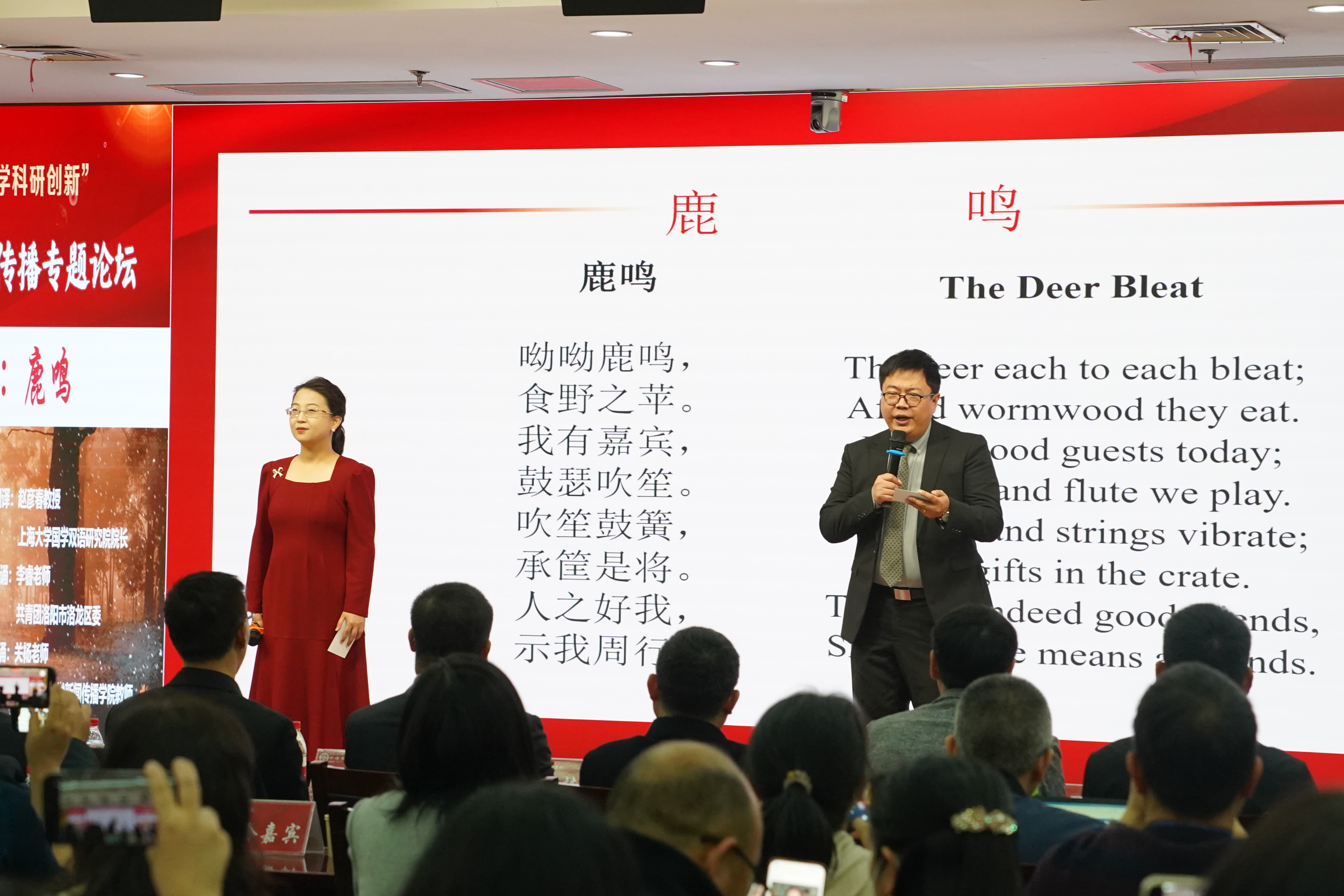 新闻传播学院关杨老师联袂献上中英诗词朗诵《鹿鸣》,迎接八方来宾。两位老师热情洋溢、声情并茂的朗诵赢得了在场全体参会者的热烈掌声,将开幕式氛围推向高潮。