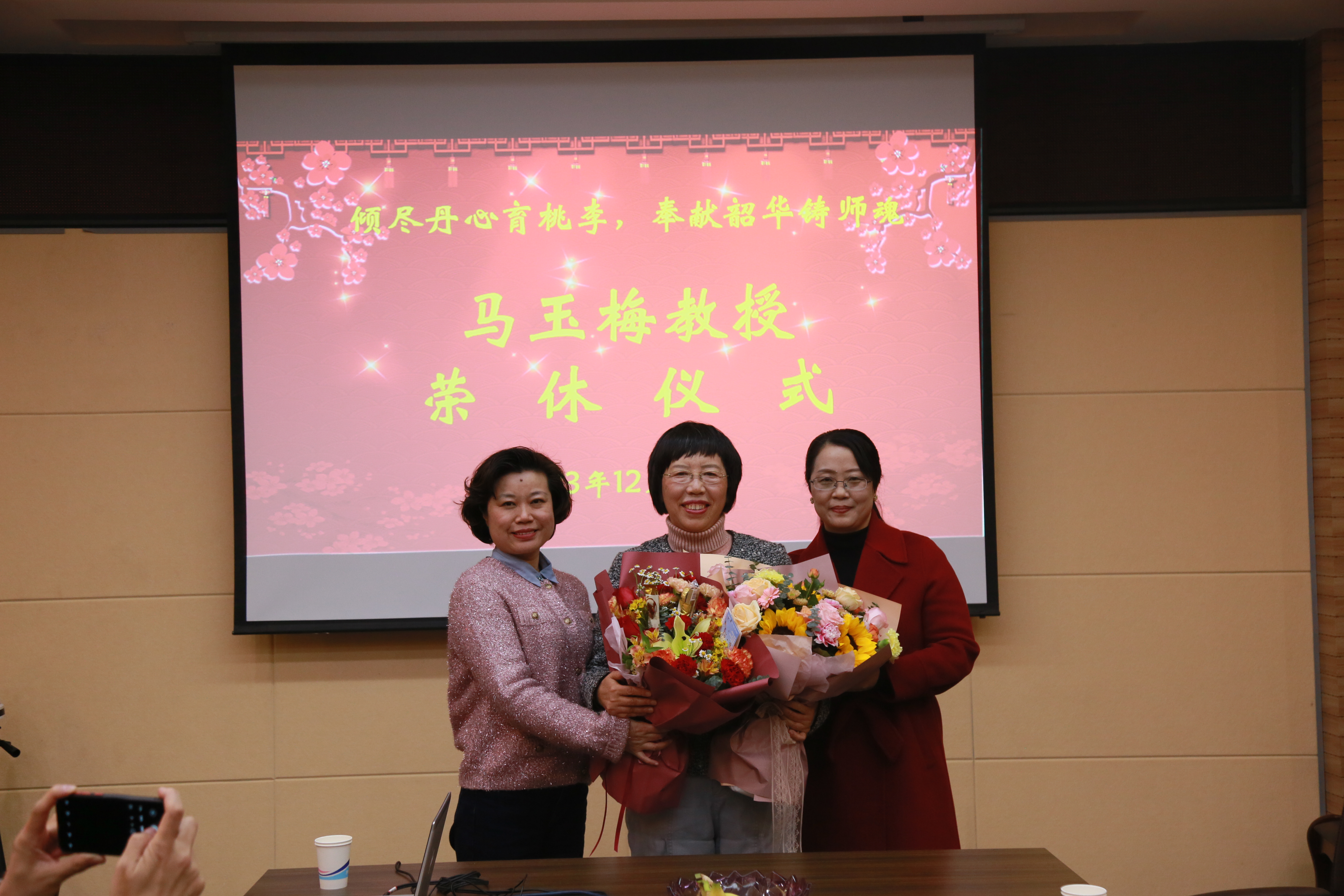 院长黄辉辉、副院长葛丽萍为马玉梅教授献上鲜花