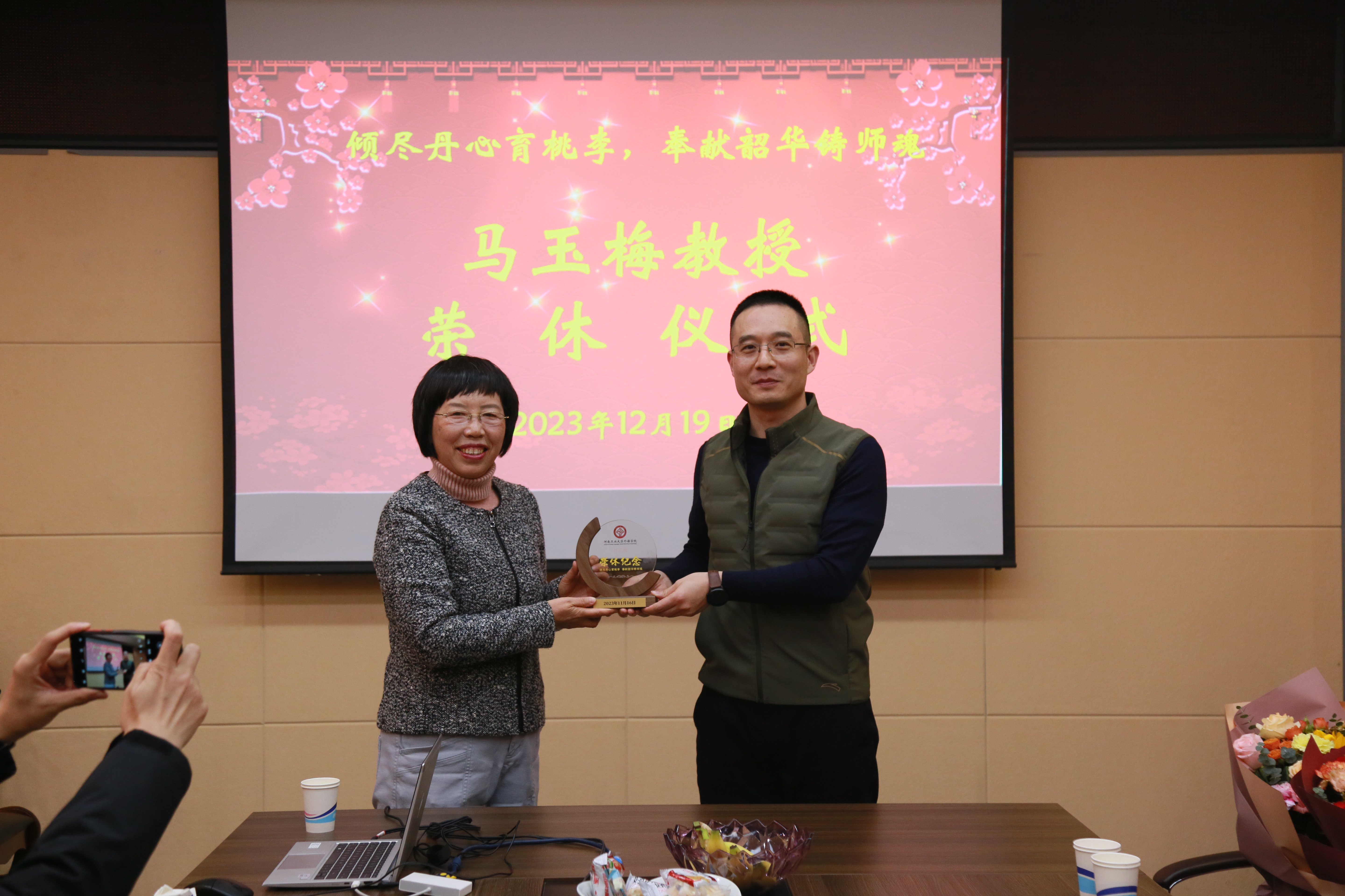 在5231会议室为马玉梅教授举行荣休仪式,学院领导班子、系部主任、支部书记、行政办公室全体老师及50余名教师代表参加仪式。仪式由院党委书记王云涛主持。