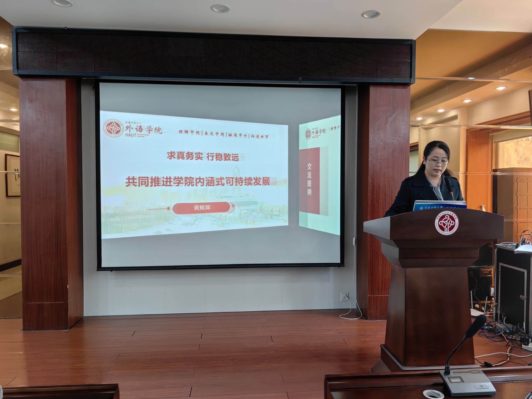 院长黄辉辉以《求真务实 行稳致远——共同推进学院内涵式可持续发展》为题作专题工作报告。她简要总结了2023年学院重点工作突破,并指出2023年在全院教职工共同努力下,学院圆满完成了各项目标考核任务,在河南省专业评价、科研经费到账、国社科项目立项、师资队伍建设等方面均取得了重大突破。在肯定成绩的同时,她结合91麻豆