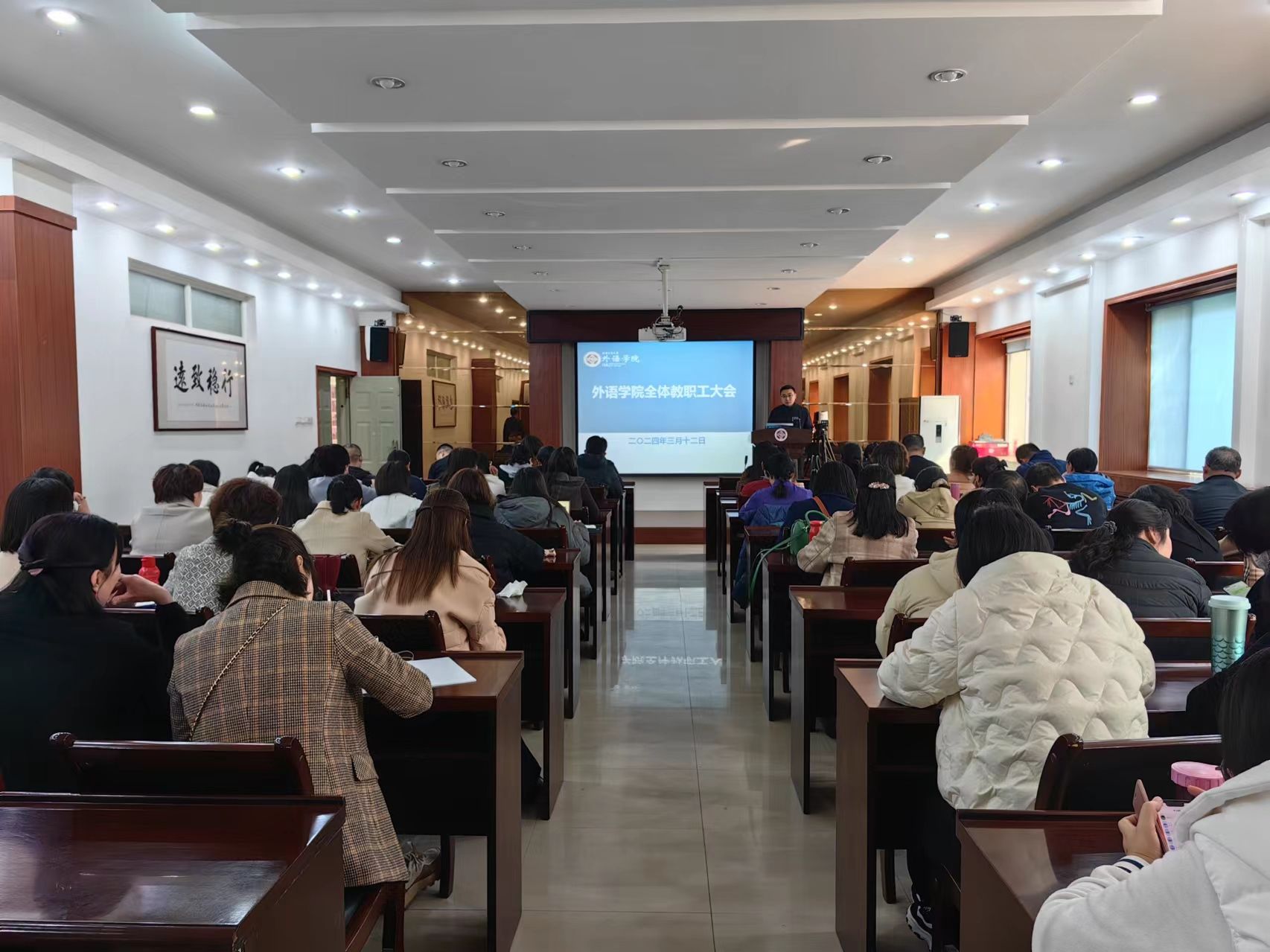 工作实际、河南省新高考制度改革等情况,深入分析了学院目前所面临的危机和挑战。一是学科点进位与博士点申报仍有较大差距;二是专业招生与发展面临冲击;三是人才培养体系不够系统,模式不够清晰;四是师资结构不够均衡,师资职称结构、年龄结构、国际化背景等有待优化;五是科研基础薄弱,教科研团队建设亟待加强;六是学院内部治理能力、资源汇聚能力、横向社会服务能力、创收能力等亟待强化。她强调,面对这些危机和挑战,全体学院教职工要时刻保持头脑清醒,提前谋划、迎难而上。最后,她向全体教职工汇报了学院2024年工作要点,并强调2024年学院要在优化本硕人才培养模式和整合学院教科研团队力量上重点发力,并号召全体教师齐心协力、奋勇拼搏、求真务实、行稳致远,共同推进学院内涵式可持续发展。