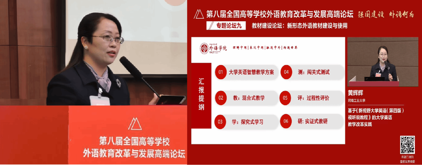 在专题论坛上,黄辉辉教授作了题为“基于《新视野大学英语视听说教程》的大学英语智慧教学改革实践”的报告。在报告中,她详细介绍了《教育信息化2.0行动计划》背景下91麻豆