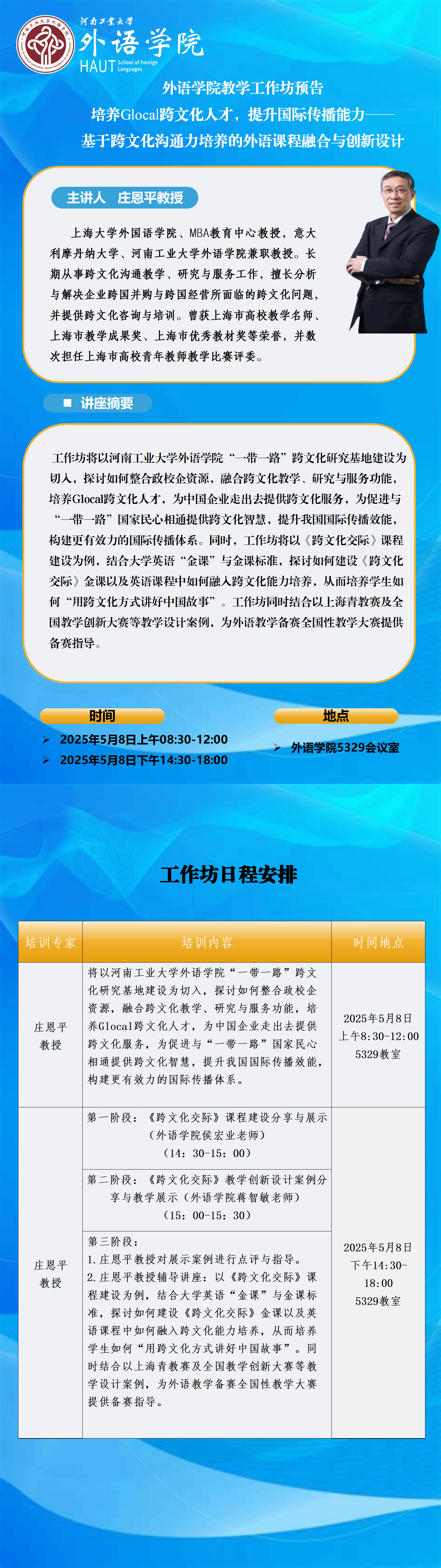 91麻豆 教学工作坊预告:培养Glocal跨文化人才,提升国际传播能力 ——基于跨文化沟通力培养的外语课程融合与创新设计