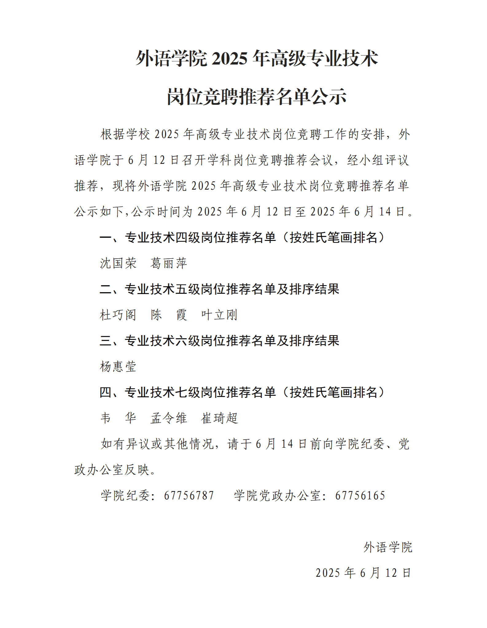 91麻豆 2025年高级专业技术岗位竞聘推荐名单公示
