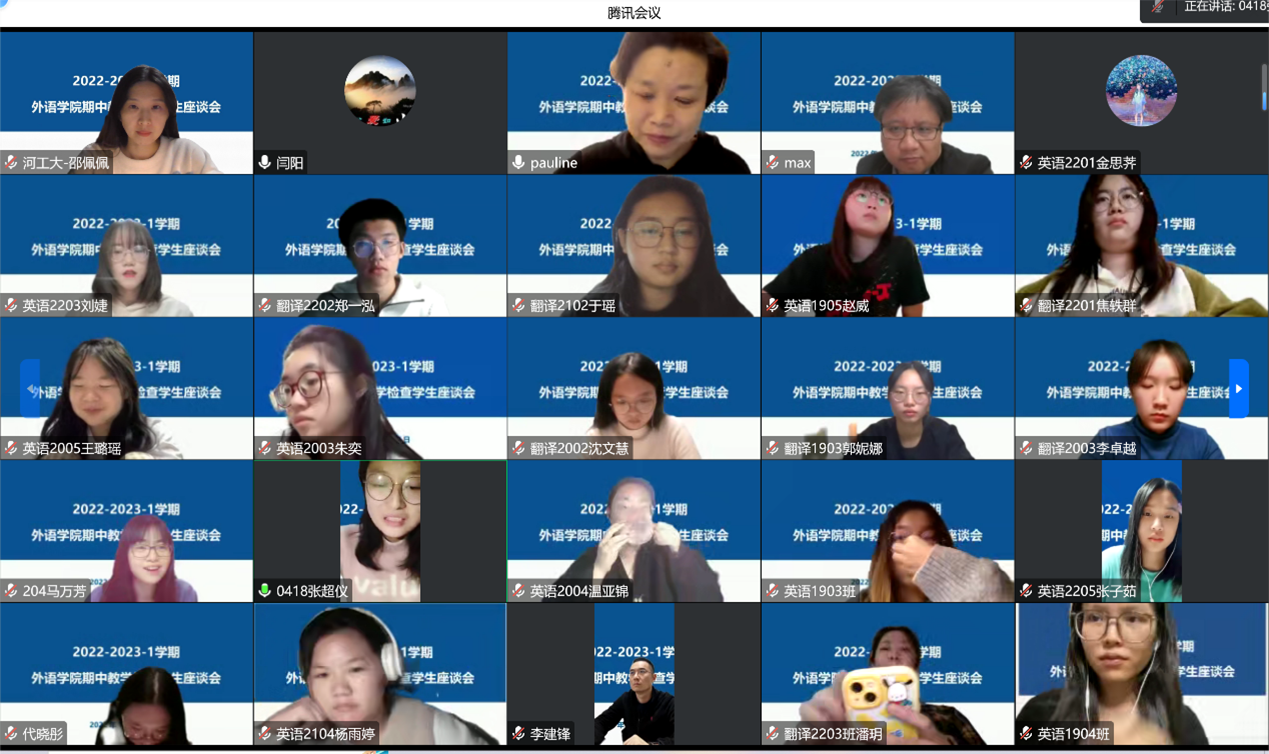 分别于11月17日、18日在线召开学生座谈会和教师座谈会,倾听师生心声,了解教情学情。学校教学督导程大友教授、教务处教师教学发展中心主任赵静、学院领导班子、本学期任课老师以及各年级学生代表等参加了座谈,会议由91麻豆