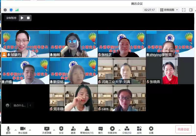 2022届硕士研究生学位论文答辩在线上圆满完成。答辩共分翻译学、语言学、文学三个组,分别邀请河南大学刘泽权教授河南大学、广东外语外贸大学卢植教授、河南大学张璟慧教授担任评审专家组组长。评审专家组成员包括中山大学王东风教授、中国海洋大学任东升教授等15名校内外专家学者组成。学院2020级、2021级全体研究生同学线上观摩了答辩。
