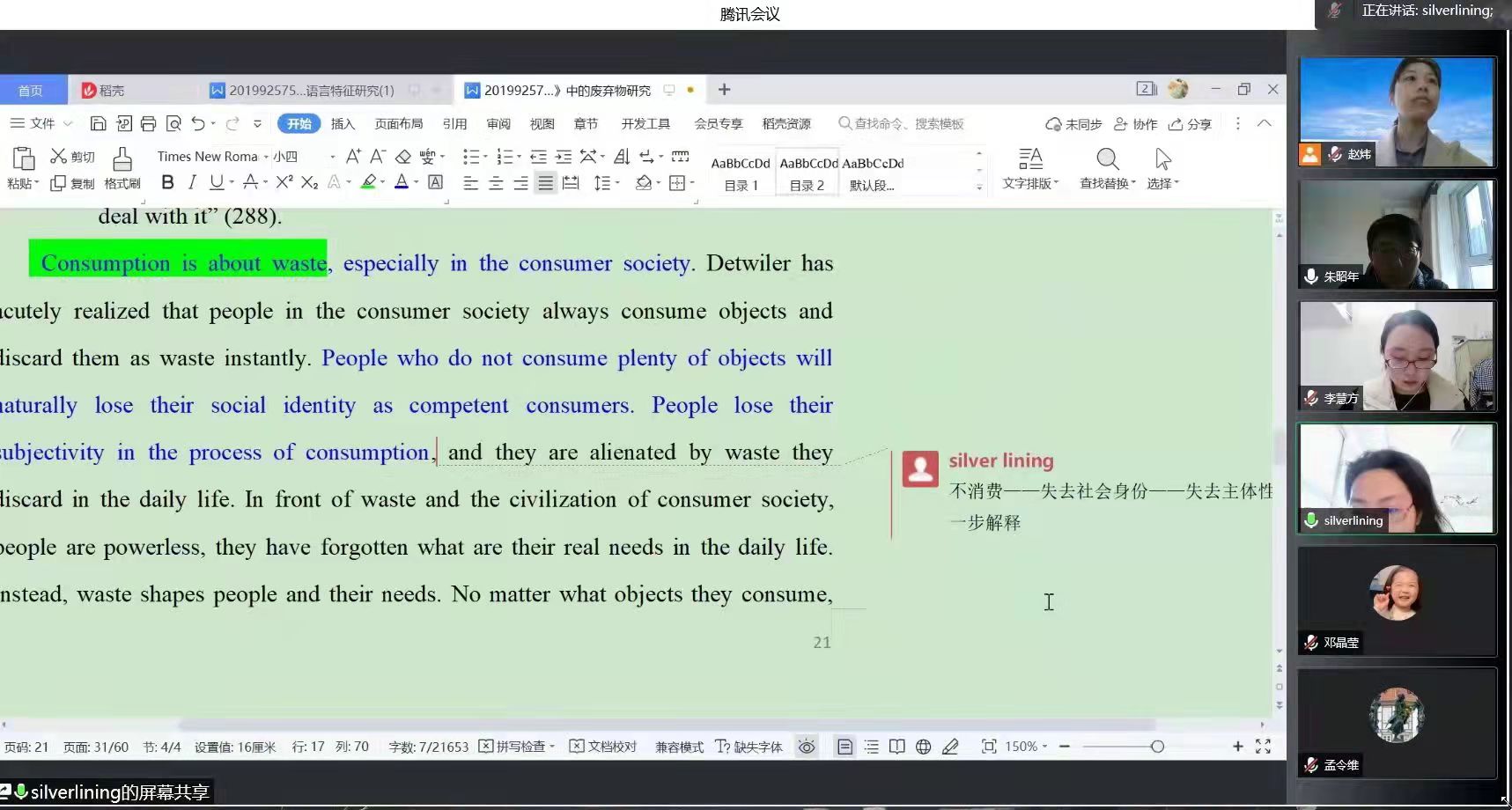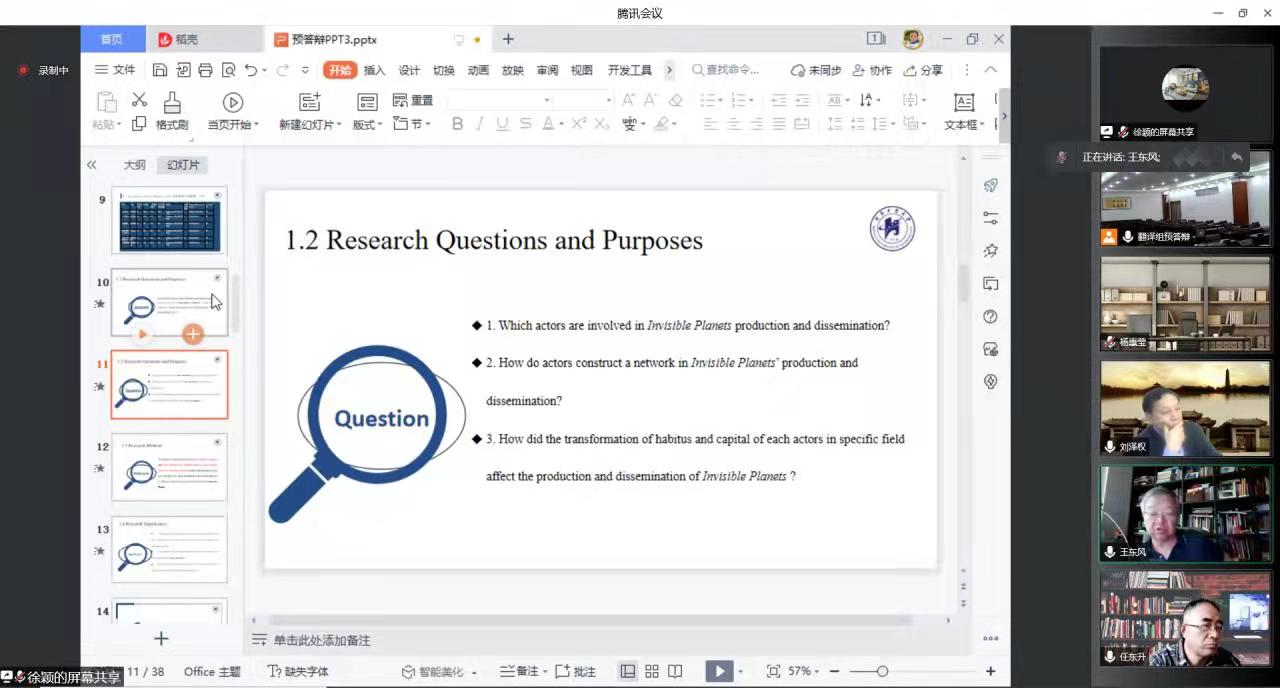 在2022年3月21日举行2019级硕士研究生学位论文预答辩工作。本次预答辩采取线上形式进行,特邀河南大学刘泽权教授、中山大学王东风教授、河南大学张璟慧教授、广东外语外贸大学卢植教授、中国海洋大学任东升教授及校内7名专家教授组成评审专家组,学院多名教师及2020级、2021级全体研究生在线旁听学习。